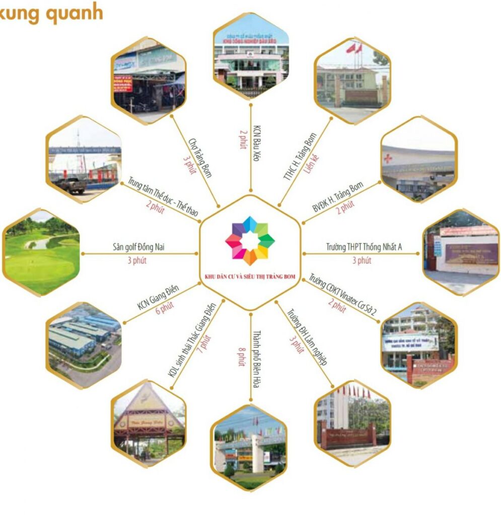 Dự án nằm cách các trung tâm chính trị – kinh tế – xã hội như: TTHC, Bệnh viện đa khoa, Y tế, Trường học, Chợ Mới Trảng Bom, trung tâm của huyện chỉ trong bán kính 1km.