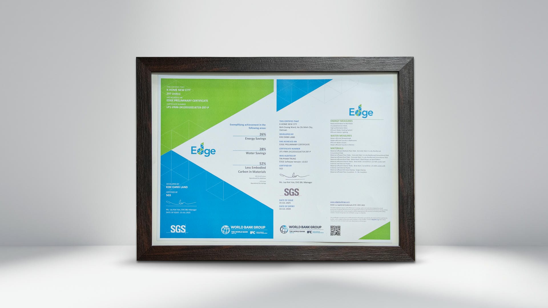 Chứng chỉ EDGE dành cho 297 căn nhà phố phân khu Bằng Lăng, dự án K-Home New City. Đây là hệ thống chứng nhận quốc tế, tập trung vào việc đánh giá và thúc đẩy các công trình xây dựng tiết kiệm tài nguyên, đặc biệt là năng lượng, nước và vật liệu do Tổ chức Tài chính Quốc tế (IFC), thuộc nhóm Ngân hàng Thế giới, khởi xướng và đang được sử dụng rộng rãi trên toàn cầu.